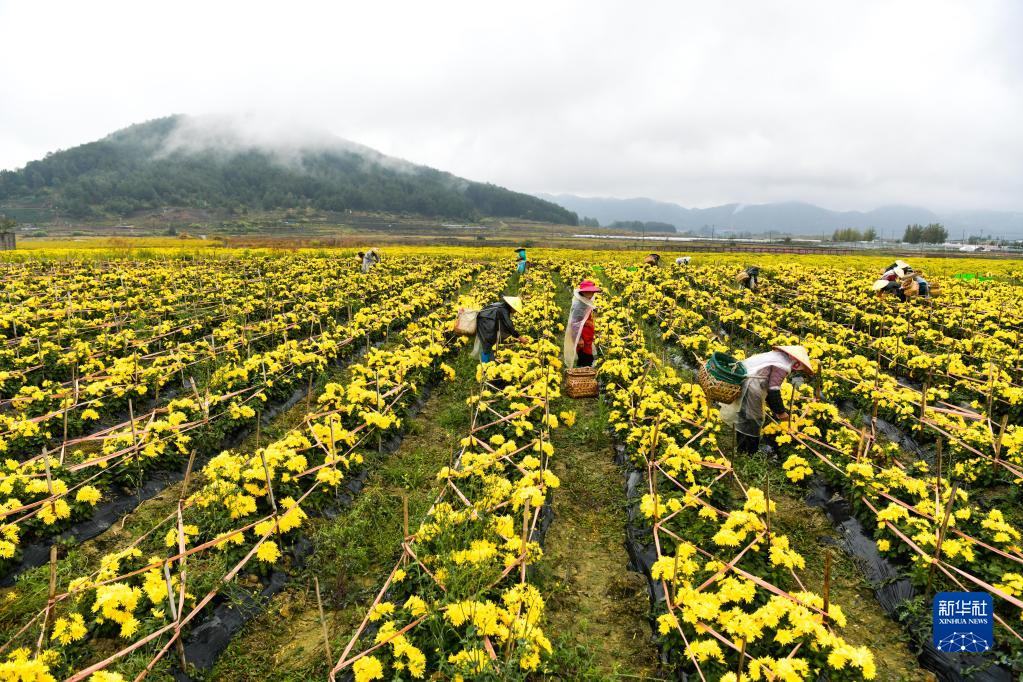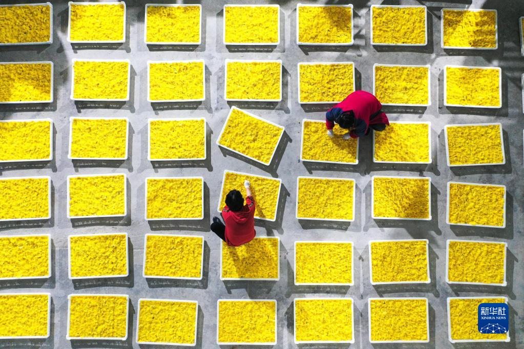 金秋時節(jié),貴州省黔南布依族苗族自治州貴定縣云霧鎮(zhèn)種植的1000余畝菊花陸續(xù)進(jìn)入采摘期,當(dāng)?shù)卮迕衩χ烧?、分揀、烘干菊花,供?yīng)市場。