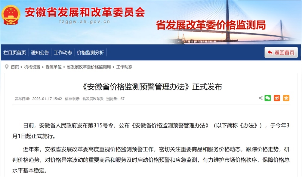 《安徽省價(jià)格監(jiān)測(cè)預(yù)警管理辦法》。圖片來(lái)源:安徽省發(fā)展和改革委員會(huì)