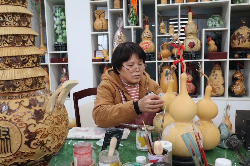 記者在一處加工點看到,今年41歲的村民李三紅正在趕制一批刻有“吉祥如意”字眼的葫蘆。李三紅10多年前從零開始學(xué)習(xí)烙刻葫蘆,現(xiàn)已成為技術(shù)骨干?!白鲆粋€葫蘆能掙六七十塊錢,抓緊點一天能做三個?!崩钊t說。