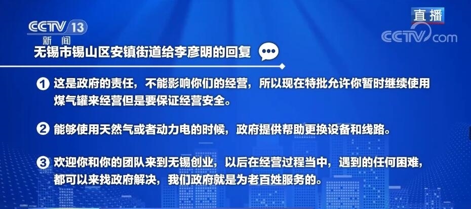 白巖松:首先我們來看看安鎮(zhèn)街道給李彥明的回復(fù)當(dāng)中的一些關(guān)鍵詞,第一個(gè),這是政府的責(zé)任,不能影響你們的經(jīng)營。第二個(gè)里頭包括能夠使用天然氣或者動(dòng)力電的時(shí)候,政府提供幫助更換設(shè)備和線路。在第三里頭有我們政府就是為老百姓服務(wù)的。咱們接下來馬上連線一下當(dāng)事人,無錫市錫山區(qū)安鎮(zhèn)街道商務(wù)科的科長鄒祎,就是他幫著辦的這個(gè)事情。鄒科長您好!您當(dāng)然感受得到您火了,在網(wǎng)上也被網(wǎng)友表揚(yáng),我特別想知道您的領(lǐng)導(dǎo)表揚(yáng)您沒有?