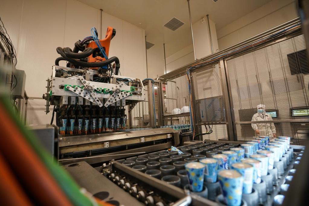 位于江蘇蘇州太倉的聯(lián)合利華和路雪生產(chǎn)基地,于2021年9月獲評全球“燈塔工廠”,成為當(dāng)?shù)亍爸悄苤圃臁钡臉?biāo)桿。工廠里,機(jī)器人正將產(chǎn)品轉(zhuǎn)移到速凍隧道。新華社記者 季春鵬 攝