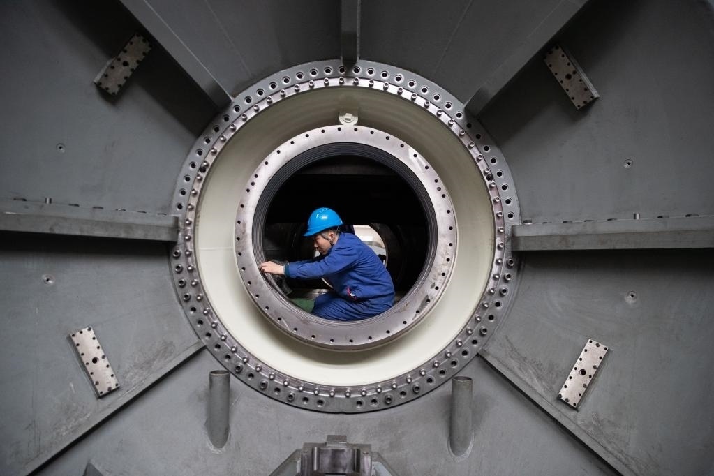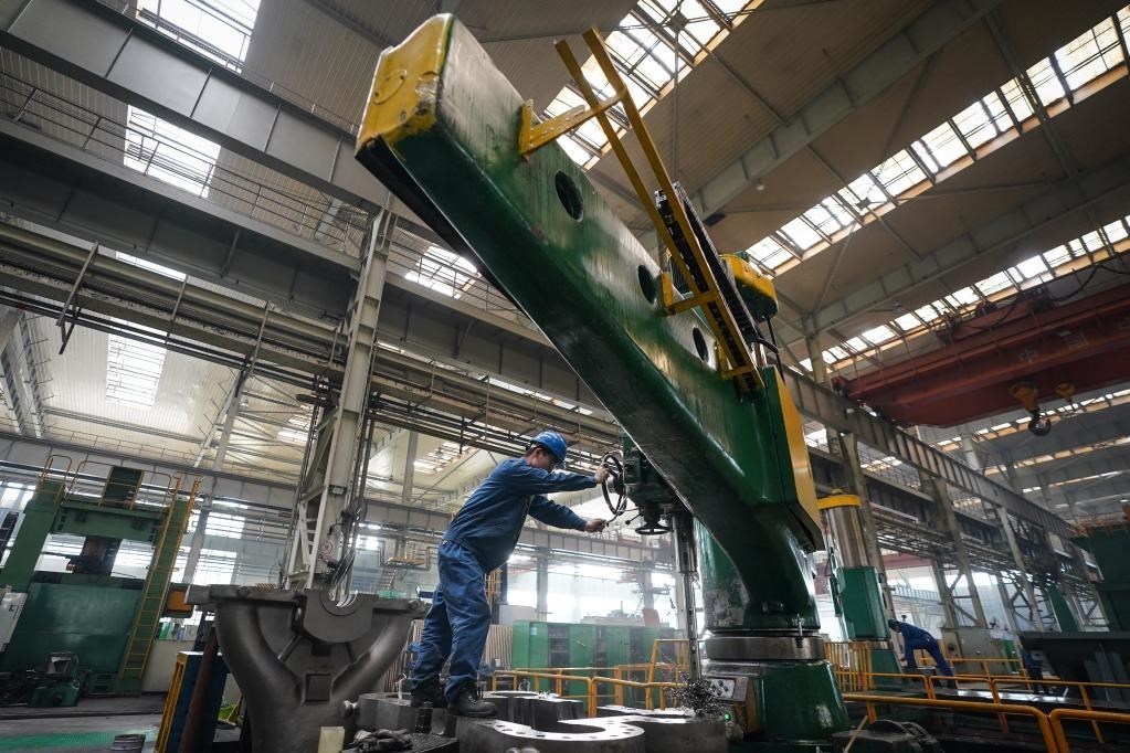 4月28日,工人在哈電集團哈爾濱汽輪機廠有限責任公司車間內生產(chǎn)作業(yè)。新華社記者 張濤 攝