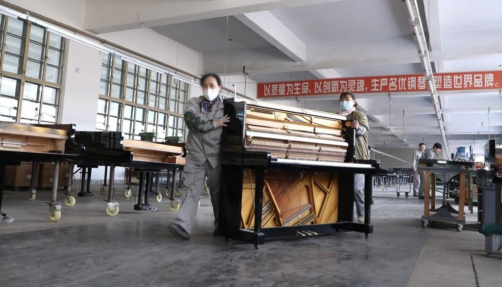 2月21日,工人在東北鋼琴樂器有限公司車間內推運鋼琴組件,趕制外貿訂單。新華社記者 姚劍鋒 攝