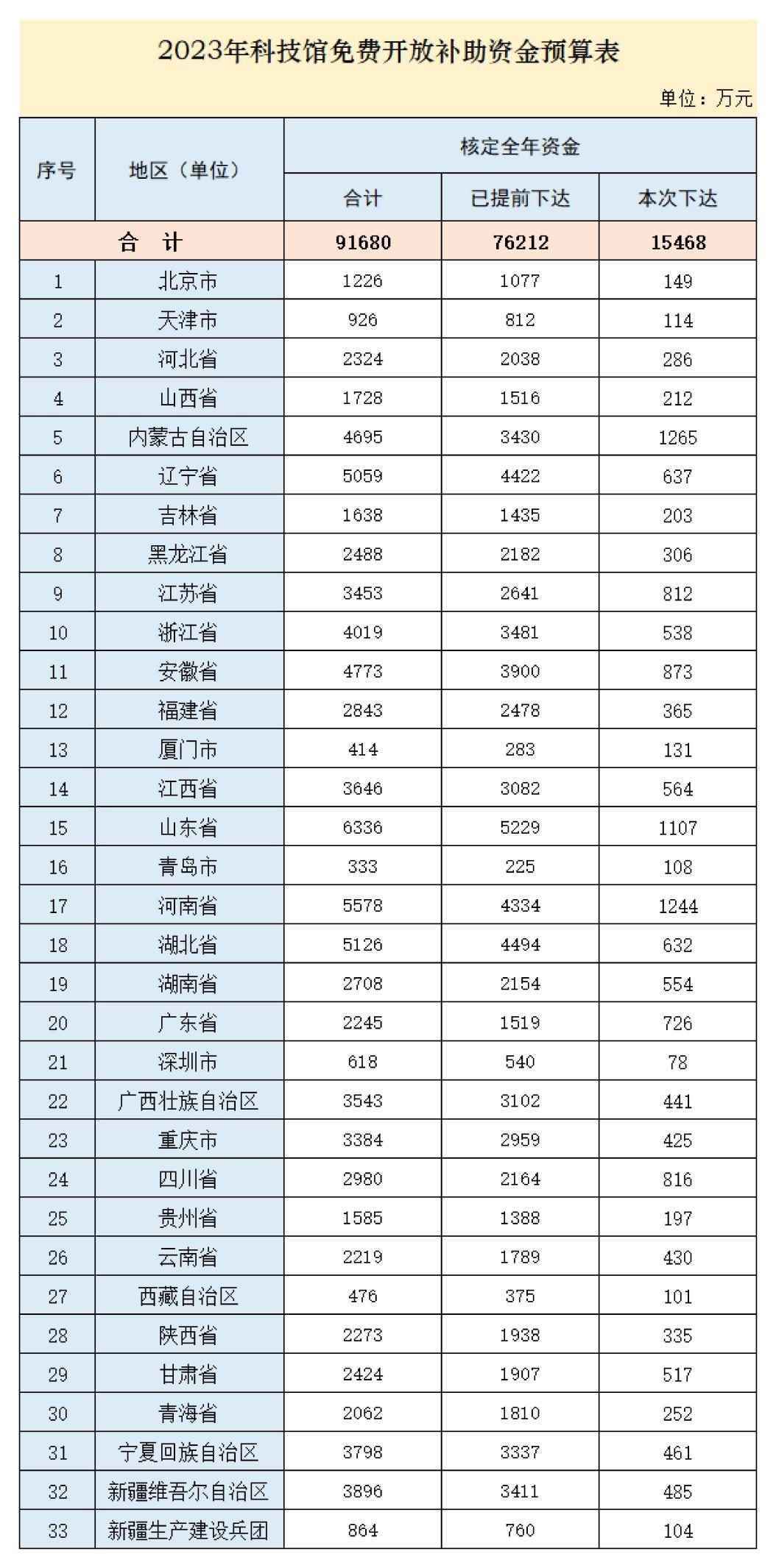 人民網(wǎng)北京5月10日電 (記者任妍)記者從財(cái)政部獲悉,為保障免費(fèi)開(kāi)放科技館正常運(yùn)轉(zhuǎn),經(jīng)研究,現(xiàn)下達(dá)2023年科技館免費(fèi)開(kāi)放補(bǔ)助資金預(yù)算,統(tǒng)籌用于各?。▍^(qū)、市)及新疆生產(chǎn)建設(shè)兵團(tuán)2023年免費(fèi)開(kāi)放科技館門票減收補(bǔ)助、運(yùn)行保障增量補(bǔ)助及展品更新補(bǔ)助等方面。數(shù)據(jù)顯示,全國(guó)核定預(yù)算91680萬(wàn)元,提前下達(dá)76212萬(wàn)元,此次下達(dá)15468萬(wàn)元。