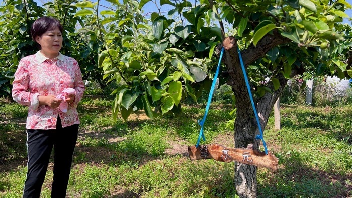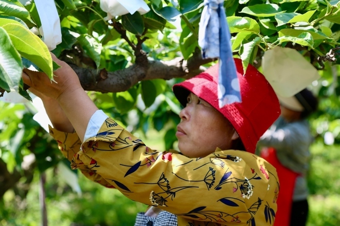 附近村民在梨園里實(shí)現(xiàn)就業(yè)。初夏時(shí)節(jié),村民給剛長(zhǎng)出的小梨“穿衣裳”。