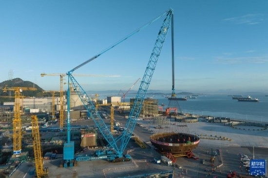 這是5月29日拍攝的三門核電二期工程4號機組核島鋼制安全殼底封頭吊裝現(xiàn)場。