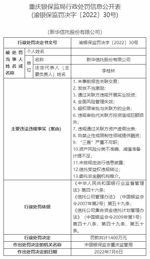 2022年下半年,重慶銀保監(jiān)局曾對新華信托開出二十余張“罰單”。