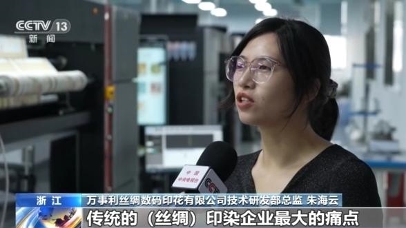 萬事利絲綢數碼印花有限公司技術研發(fā)部總監(jiān) 朱海云:傳統的絲綢印染企業(yè)最大的痛點就是庫存壓力,現在我們通過人工智能AI的設計,再加上我們的一體機快返的工藝特點,它能夠達到一個先銷后產的經營模式,能夠解決我們庫存壓力的痛點。