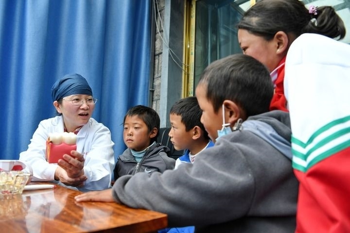 在西藏浪卡子縣普瑪江塘鄉(xiāng),上海市徐匯區(qū)牙病防治所的醫(yī)生蘇紅如向小朋友科普牙齒保健知識(2023年7月8日攝)。新華社記者 張汝鋒 攝