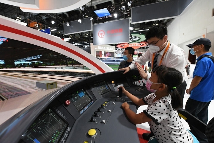 小朋友在2022年中國國際服務(wù)貿(mào)易交易會國家會議中心展館體驗京張高鐵動車組模擬駕駛臺(2022年9月3日攝)。新華社記者 任超 攝