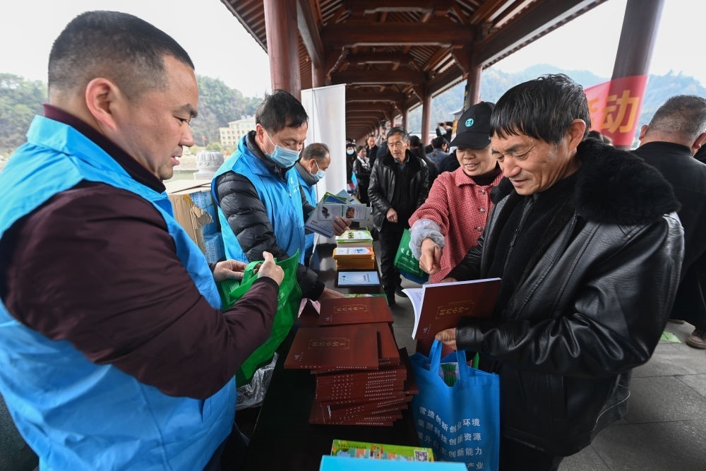 在杭州市臨安區(qū)昌化鎮(zhèn)舉行的春季文化科技衛(wèi)生“三下鄉(xiāng)”服務(wù)活動上,臨安區(qū)科學技術(shù)協(xié)會“三服務(wù)”小分隊的黨員志愿者將科普書籍贈送給當?shù)厝罕姡?023年2月22日攝)。新華社記者 徐昱 攝