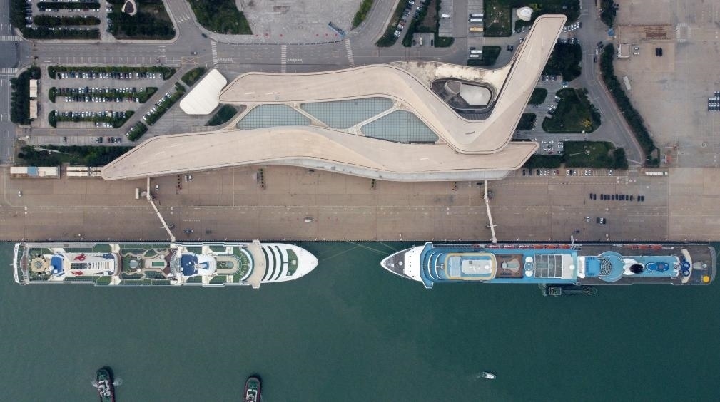 9月27日,“夢想”號(hào)郵輪(左)、“地中?!碧?hào)郵輪靠泊在天津國際郵輪母港準(zhǔn)備啟航(無人機(jī)照片)。新華社記者 趙子碩 攝