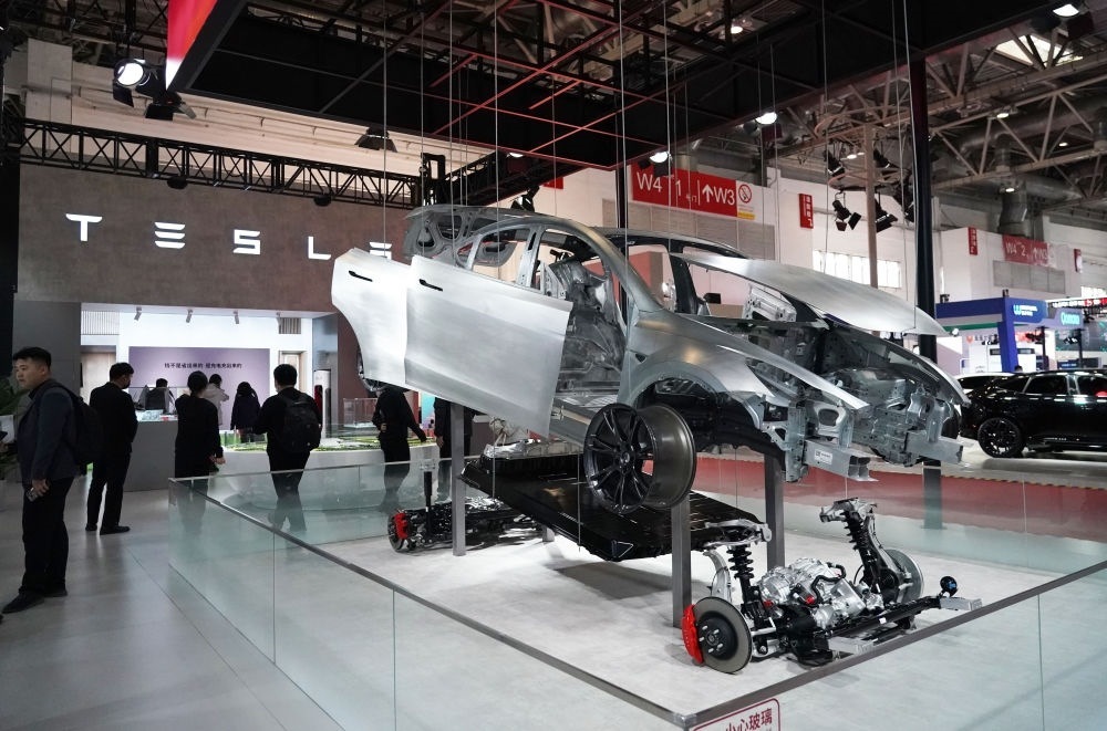 這是在首屆中國國際供應(yīng)鏈促進博覽會現(xiàn)場拍攝的特斯拉展位(2023年11月30日攝)。新華社記者 任超 攝