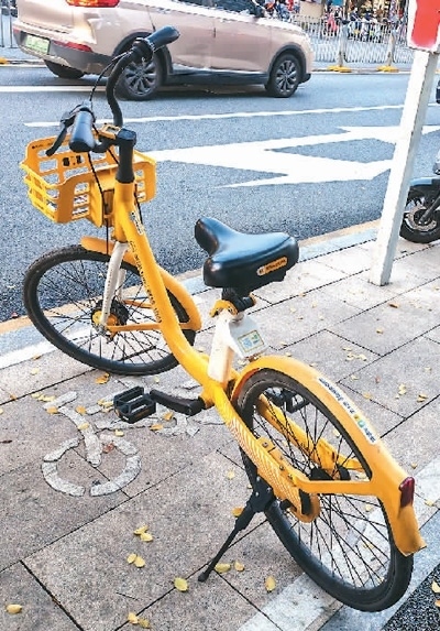 廣東深圳福田區(qū)福中路上,一輛共享單車停放于專門劃定的還車點(diǎn)內(nèi)。本報(bào)記者 盧澤華攝