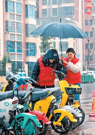 江西省贛州市興國(guó)縣長(zhǎng)征社區(qū)志愿者在網(wǎng)格區(qū)整理共享單車。陳鵬攝(人民視覺(jué))