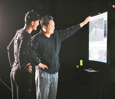 4月30日,在天津市濱海新區(qū)國(guó)家動(dòng)漫園里的大型動(dòng)作捕捉棚內(nèi),身著特定裝備的動(dòng)捕演員(左)和同事在查看電腦生成的虛擬角色動(dòng)作。新華社記者 趙子碩攝