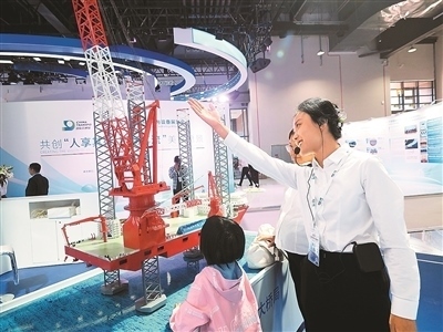 第十六屆國際交通技術(shù)與設備展覽會上,觀眾在參觀“大橋海風”號風電安裝船。杜建坡攝(人民圖片)