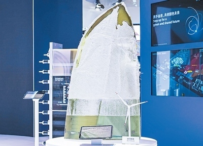 西門子能源展出全球首款可回收風(fēng)機(jī)葉片。葉片使用周期結(jié)束后,其部件材料可通過工業(yè)化方式,進(jìn)行樹脂和纖維材料的安全環(huán)保分離,回收的纖維材料仍保持良好性能。本報記者 廖睿靈攝