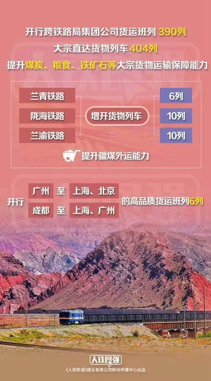 貨運方面,鐵路部門統(tǒng)籌運用線路、場站資源,安排開行跨鐵路局集團(tuán)公司貨運班列390列,大宗直達(dá)貨物列車404列,提升煤炭、糧食、鐵礦石等大宗貨物運輸保障能力,為冬季能源保供和國民經(jīng)濟(jì)平穩(wěn)運行提供有力支撐。其中,優(yōu)化調(diào)整蘭州鐵路樞紐列車運行方案,蘭青、隴海、蘭渝鐵路分別增開貨物列車6列、10列、10列,提升疆煤外運能力。適應(yīng)貨運市場需求,優(yōu)化貨運班列產(chǎn)品供給,開行廣州至上海、北京,成都至上海、廣州的高品質(zhì)貨運班列6列,串聯(lián)京津冀、長三角、粵港澳大灣區(qū)、成渝地區(qū)等主要經(jīng)濟(jì)區(qū)域,打造快捷物流產(chǎn)品示范線。