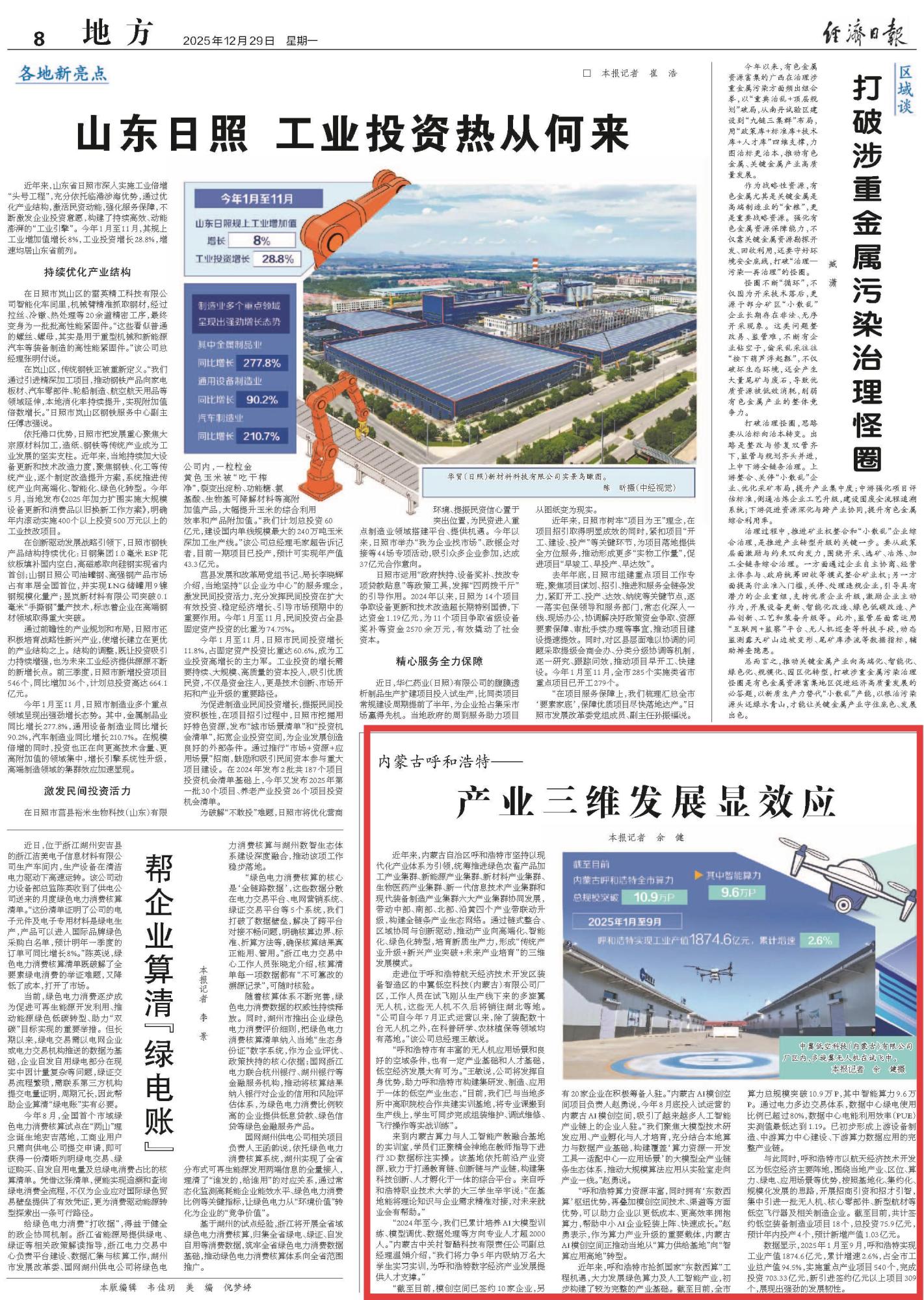 2025年12月29日,《經(jīng)濟(jì)日?qǐng)?bào)》第8版刊發(fā)題為《內(nèi)蒙古呼和浩特——產(chǎn)業(yè)三維發(fā)展顯效應(yīng)》的文章,報(bào)道了內(nèi)蒙古自治區(qū)呼和浩特市堅(jiān)持以現(xiàn)代化產(chǎn)業(yè)體系為引領(lǐng),通過鏈?zhǔn)秸?、區(qū)域協(xié)同與創(chuàng)新驅(qū)動(dòng),推動(dòng)產(chǎn)業(yè)向高端化、智能化、綠色化轉(zhuǎn)型,培育新質(zhì)生產(chǎn)力,形成“傳統(tǒng)產(chǎn)業(yè)升級(jí)+新興產(chǎn)業(yè)突破+未來產(chǎn)業(yè)培育”的三維發(fā)展模式。