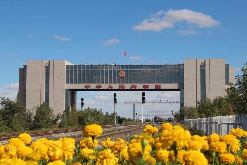 國門莊嚴(yán)肅穆,在國門乳白色的門體上方嵌著"中華人民共和國"7個(gè)鮮紅大字,上面懸掛的國徽閃著的金光,國際鐵路在下面通過。國門下方的中蒙鐵路,是連接首都北京和烏蘭巴托、莫斯科的鐵路交通大動(dòng)脈,被譽(yù)為“歐亞大陸橋”。