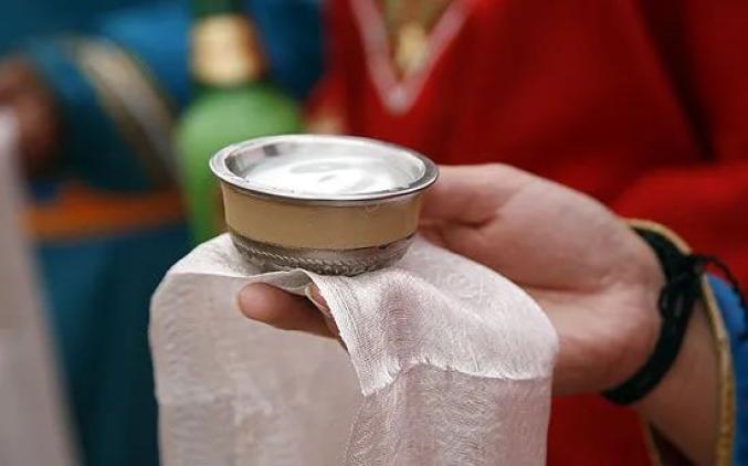 傳統(tǒng)鍋茶的制作方法是先用銅鍋將奶茶熬好,之后加入風(fēng)干肉、奶酪、奶皮子等,在鍋中邊煮邊吃。吃的時(shí)候?qū)⒛滩枋⒃谕胫?,加上奶豆腐和炒米,再和黃油混在一起。越往后,炒米和奶豆腐泡得越軟,味道口感越好。鍋茶咸咸的口味中含有濃濃的奶香,讓人回味無(wú)窮。