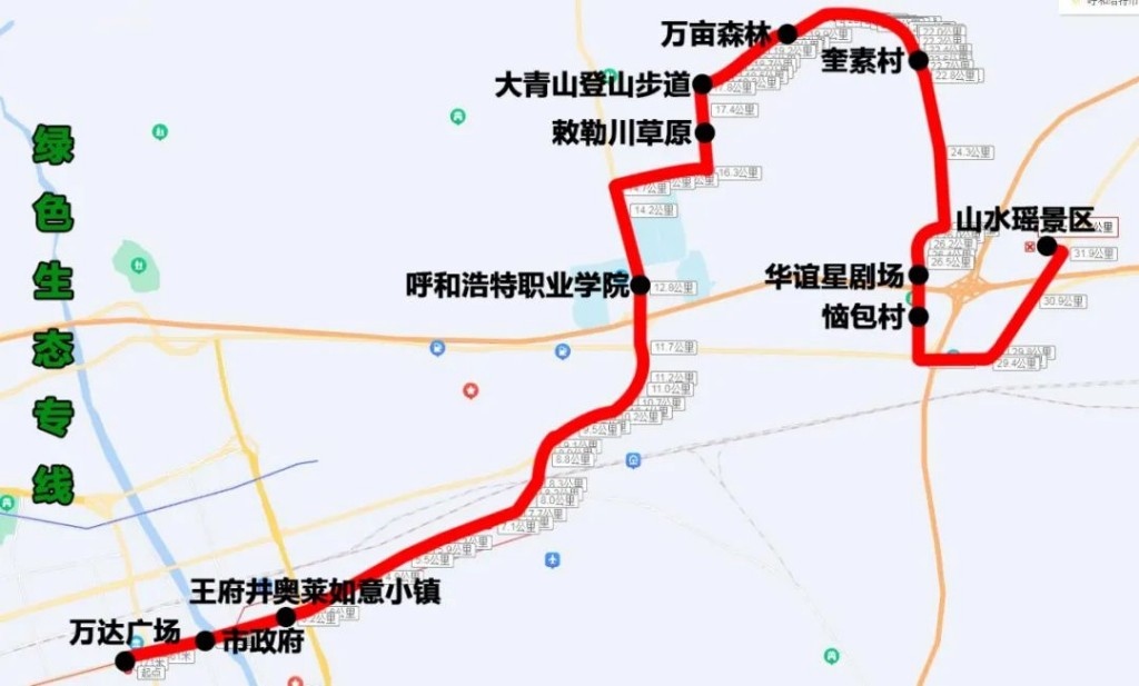 綠色生態(tài)專線(萬達(dá)廣場(chǎng)——山水瑤景區(qū))途經(jīng):新華東街、機(jī)場(chǎng)路、S101、呼和塔拉東街、野馬圖路、Y371、惱包路、110國道、S105省道。沿途設(shè)站:萬達(dá)廣場(chǎng)、市政府、王府井奧萊如意小鎮(zhèn)、呼和浩特職業(yè)學(xué)院、敕勒川草原、大青山登山步道、萬畝森林、奎素村、華誼星劇場(chǎng)、惱包村、山水謠景區(qū),單程:33公里,配車:8—10臺(tái)。