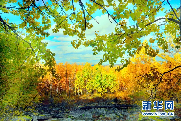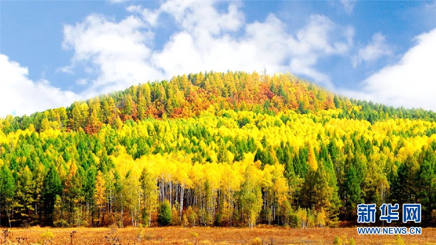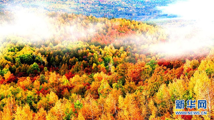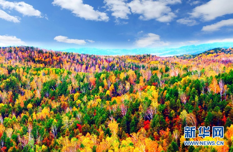 松樹林、白樺林、柞樹林和一片片混交林“染”成不同色彩,茫茫林海宛若一幅匠心獨運(yùn)的繽紛畫卷。(9月28日攝)新華網(wǎng)發(fā)(欒維敬 攝)