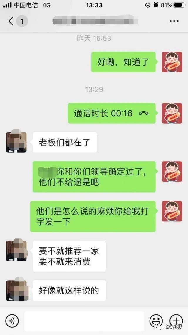 高先生提供給記者的一份微信聊天記錄顯示,當(dāng)高先生提出退還押金的要求時(shí),白泉山莊海世盛宴的工作人員告知,要不就推薦其他人到這里舉辦婚禮,要不就來這里消費(fèi)以抵消押金??傊航鹗遣荒芡说?。