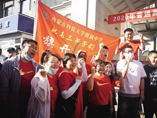 在包四中考場,不少畢業(yè)班的老師身穿紅色T恤,前來給考生們送考,加油。