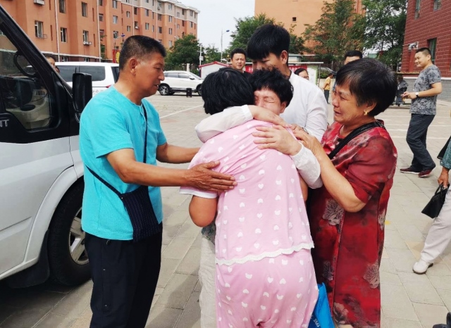 當(dāng)一行人下車(chē)后看到,迎接他們的李曉霞親人和包頭社會(huì)救助站的工作人員時(shí)都很激動(dòng),李曉霞與家人團(tuán)聚相擁而泣時(shí),在場(chǎng)的每一個(gè)人都感動(dòng)不已。