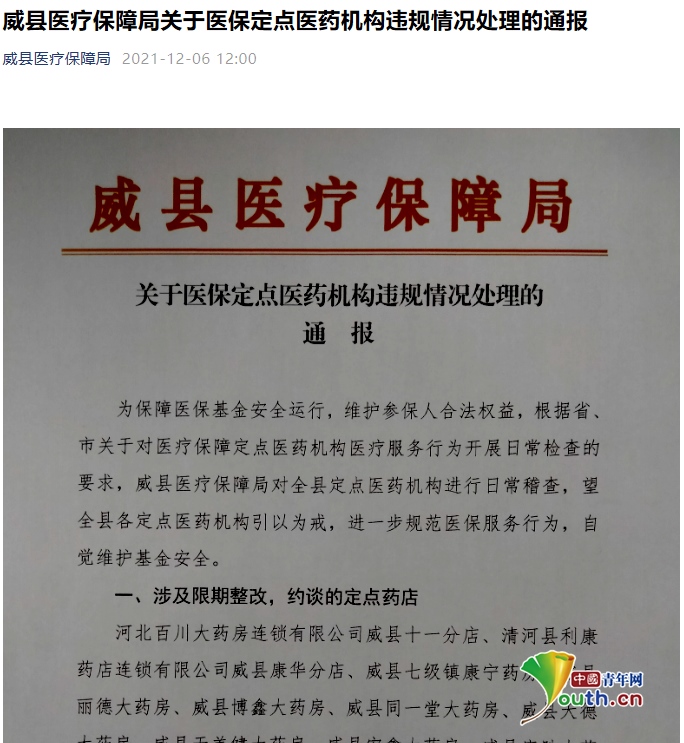 中國(guó)青年網(wǎng)邢臺(tái)12月8日電 (記者 姜文山)2021年12月6日河北省威縣醫(yī)療保障局官方微信公眾號(hào)發(fā)布《威縣醫(yī)療保障局關(guān)于醫(yī)保定點(diǎn)醫(yī)療機(jī)構(gòu)違規(guī)情況處理的通報(bào)》顯示。河北威縣醫(yī)療保障局在進(jìn)行日常稽查檢查中發(fā)現(xiàn),63家定點(diǎn)藥店被通報(bào)整改、暫停結(jié)算、約談負(fù)責(zé)人等處理。包括威縣人民醫(yī)院、威縣中醫(yī)院、威縣婦幼保健計(jì)劃生育服務(wù)中學(xué)在內(nèi)的36家定點(diǎn)醫(yī)療機(jī)構(gòu)被通報(bào)。