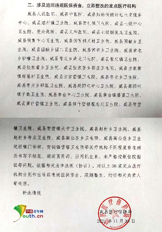 記者從公開(kāi)信息了解到,威縣地處冀南黑龍港流域,轄11鎮(zhèn)5鄉(xiāng)、1個(gè)省級(jí)高新區(qū)、1個(gè)國(guó)家農(nóng)業(yè)科技園區(qū)。按照每個(gè)鄉(xiāng)鎮(zhèn)一所衛(wèi)生院來(lái)說(shuō),被通報(bào)的定點(diǎn)醫(yī)療機(jī)構(gòu)中,涉及17個(gè)鄉(xiāng)鎮(zhèn)衛(wèi)生院,幾乎是已全部涉嫌違規(guī)行為被通報(bào)。