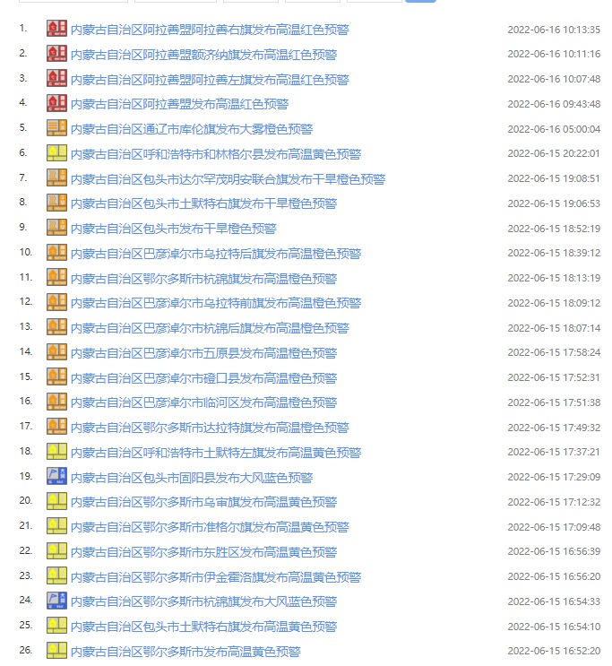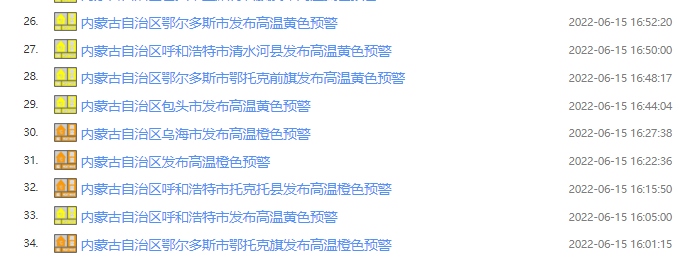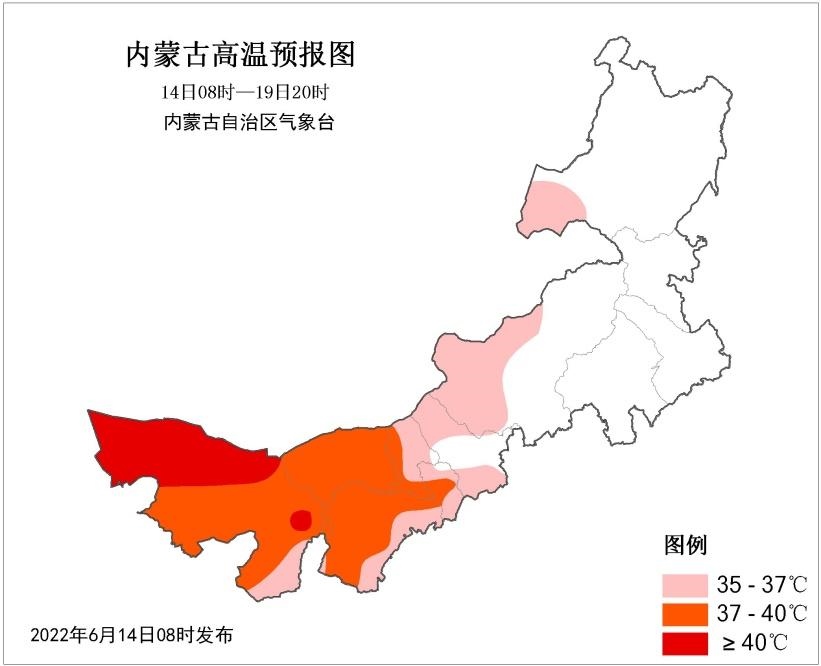 據(jù)內蒙古氣象臺預計,6月16~20日連續(xù)5天,內蒙古西部及中部偏西大部地區(qū)(阿拉善盟、烏海市、巴彥淖爾市、鄂爾多斯市、包頭市、呼和浩特市等大部地區(qū))將迎來今年首次大范圍35℃以上高溫天氣,其中,西部部分地區(qū)最高氣溫將達37℃及以上,局地超過40℃;20~21日阿拉善盟高溫將逐漸減弱消失,而35℃以上高溫天氣向錫林郭勒盟西部延伸。