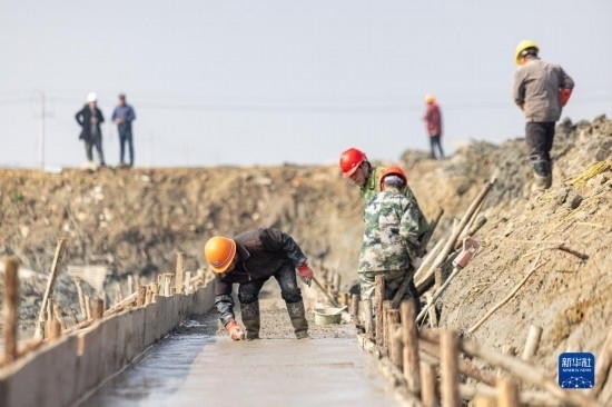 2月16日,工人在浙江省湖州市長興縣虹星橋鎮(zhèn)修建水渠。