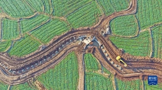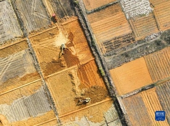 2月16日,在湖南省永州市道縣壽雁鎮(zhèn)芽洞村,工人駕駛挖掘機在高標準農田建設項目現(xiàn)場施工(無人機照片)。