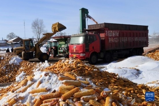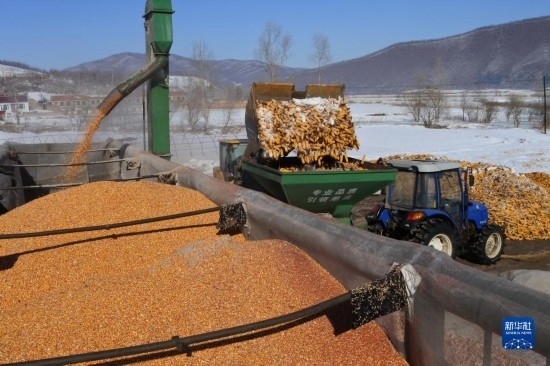 2月15日,在黑龍江省牡丹江市林口縣刁翎鎮(zhèn)三家子村,農民利用設備將玉米脫粒,為春耕做準備。
