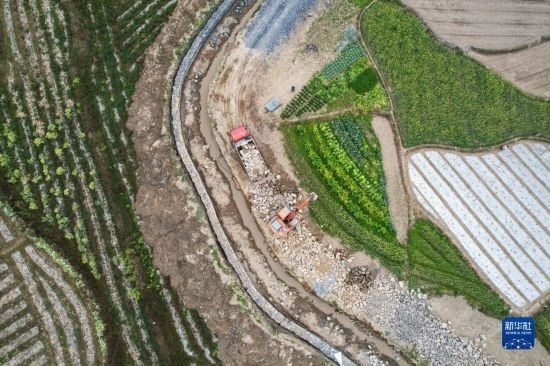 2月16日,在浙江省臺州市仙居縣雙廟鄉(xiāng),工人在水渠及機耕道路施工現(xiàn)場施工(無人機照片)。