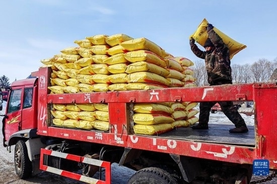 2月16日,北大荒集團五大連池農場科技服務中心工人在裝運肥料。