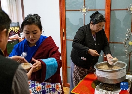 在位于森布日安置點(diǎn)的家中,石秀次仁的家人在盛“古突”(2月19日攝)。