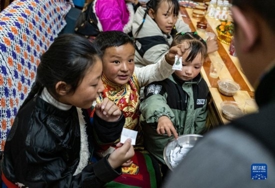 在位于森布日安置點(diǎn)的家中,石秀次仁家的孩子們?cè)谙蚣胰苏故咀约弘S機(jī)拿取的小紙條。畫(huà)在紙條上的圖案有著不同的寓意(2月19日攝)。