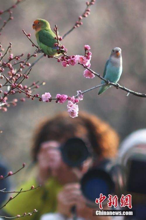 2月20日,江蘇南京,牡丹鸚鵡在梅花山梅花樹(shù)上“賞”梅,吸引市民拍照。牡丹鸚鵡由南京一市民飼養(yǎng),每年在梅花盛開(kāi)的時(shí)候,他都會(huì)帶著鸚鵡來(lái)到這里“賞”梅,同時(shí)也成為一景。 中新社記者 泱波 攝