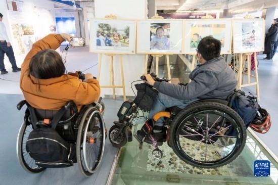 2月22日,肢殘人士乘著輪椅參觀“融合無(wú)障愛(ài)、攜手向未來(lái)”殘障融合主題兒童青少年攝影作品巡展。