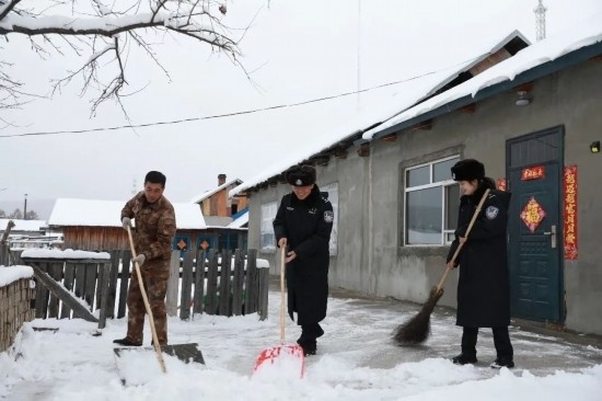 圖為史先強(qiáng)夫妻幫助村民掃雪。
