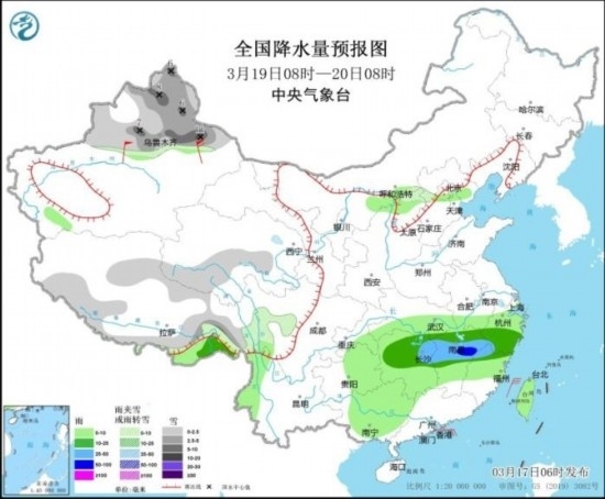 3月19日08時至20日08時,新疆北疆大部和沿天山地區(qū)、西藏北部和南部、青海南部等地部分地區(qū)有小到中雪或雨夾雪,其中,新疆沿天山地區(qū)和東部等地部分地區(qū)有大到暴雪(10~11毫米)。西藏東南部、湖南中北部、江西中北部、浙江南部、福建北部等地部分地區(qū)有中到大雨,其中,江西中部、福建西北部等地局地有暴雨。新疆南疆盆地和東部等地部分地區(qū)有7~9級風(fēng)。