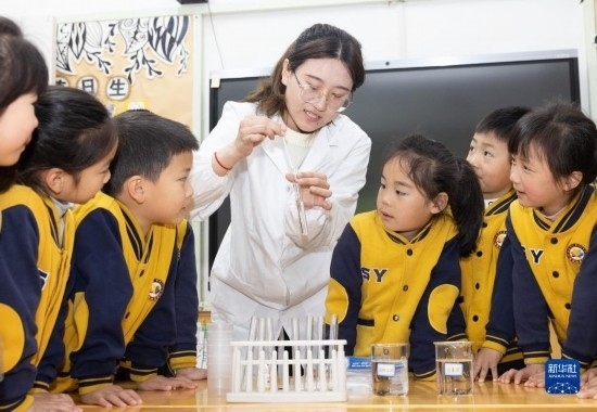 3月22日,在浙江省諸暨市實(shí)驗(yàn)幼兒園,老師帶領(lǐng)小朋友做水樣檢測(cè)實(shí)驗(yàn)。