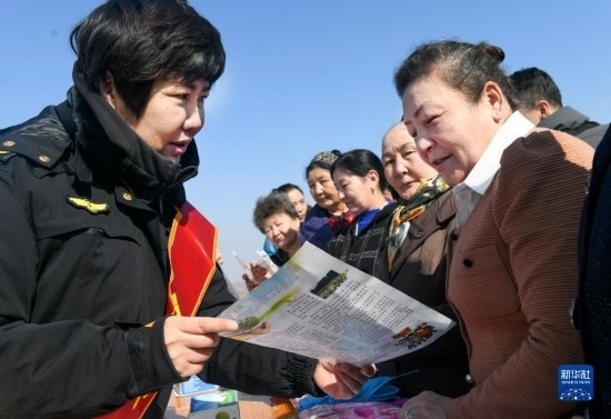 3月22日,在烏魯木齊水業(yè)集團(tuán)有限公司烏拉泊水庫(kù)管理站,烏魯木齊市生態(tài)環(huán)境局天山區(qū)分局工作人員(左)給居民講解烏魯木齊飲用水的來(lái)源。