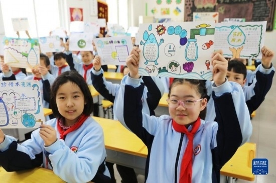 3月22日,河南省平頂山市寶豐縣山河路小學(xué)學(xué)生展示自己制作的節(jié)水護(hù)水畫(huà)報(bào)。