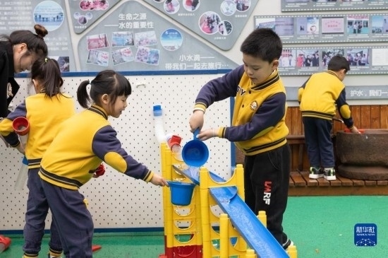 3月22日,浙江省諸暨市實(shí)驗(yàn)幼兒園的小朋友在體驗(yàn)?zāi)M水循環(huán)裝置。