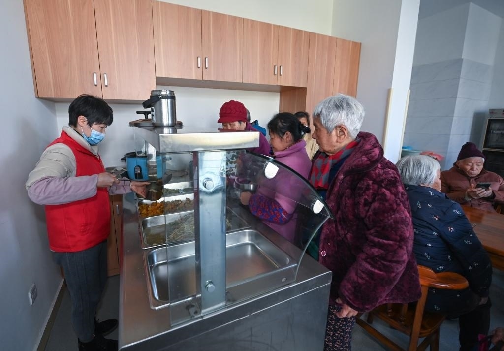 2023年2月21日,老人們?cè)诤贾菔信R安區(qū)錦南街道居家養(yǎng)老服務(wù)中心的食堂用餐。新華社記者徐昱攝